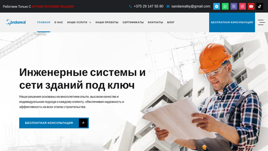 | AI-анализ | --- The website Sandareal.by is a company based in Minsk, Belarus, offering engineering systems and networks installation services to legal entities. Their services include electrical works, ventilation, heating, automation, fire suppression systems, anti-gas protection, network cabling, signaling and alert systems, water supply and sewage, and project implementation. The company offers free consultation. The website contains sections for about the company, their services, projects, certificates, contacts, and a blog. They work exclusively with legal entities. The website has a modern design and is available in Belarusian and Russian languages. The company boasts a long-term experience, high-quality products, and individual approach to each client. They use only the best materials and advanced technologies to ensure reliability and efficiency in all stages of construction. The company aims to build strong and trustworthy relationships with clients based on transparency and |