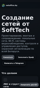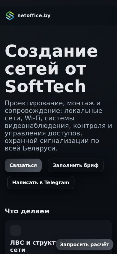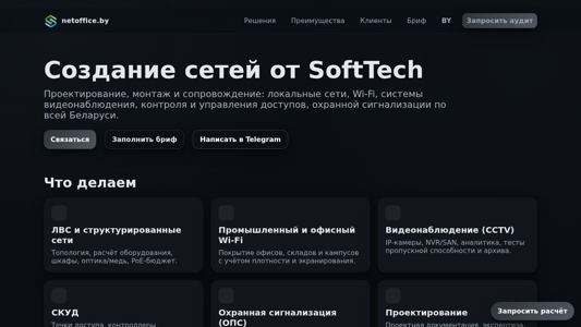| AI-анализ | This online resource, netoffice.by, is a website belonging to SoftTech, a company offering network solutions in Belarus. The website highlights their services in designing, installing, and maintaining local networks, Wi-Fi systems, CCTV, access control and management systems, and security alarm systems throughout Belarus. Users can contact the company by filling out a brief, writing in Telegram, or by scheduling an audit. The website discusses their expertise in structured networks, including cabling, equipment, PoE budgets, and industrial and office Wi-Fi coverage. They also provide solutions for video surveillance using IP cameras, NVR/SAN, analytics, and testing. Additionally, they offer services for structured cabling systems, including access points, controllers, biometric systems, turnstiles, and shunts for security alarm systems. The website emphasizes their team of experts, commitment to quality and |