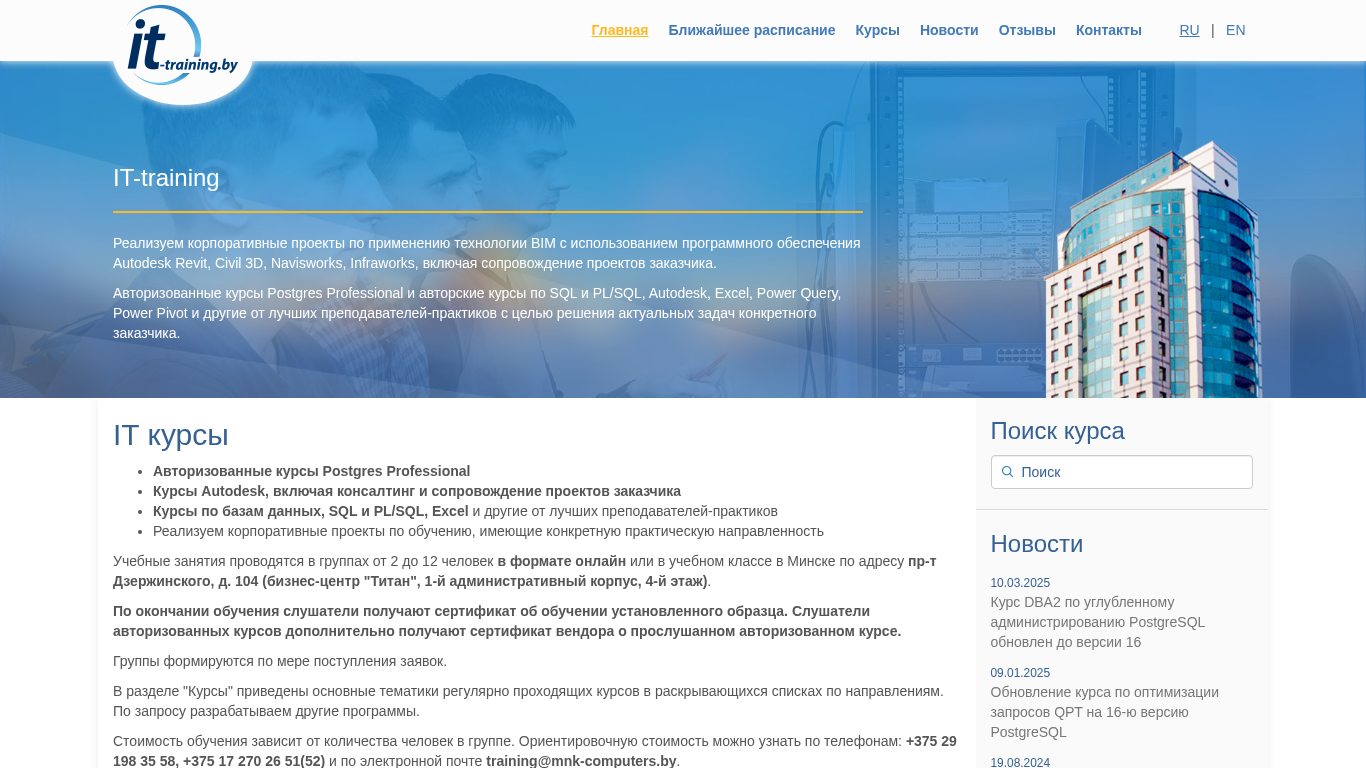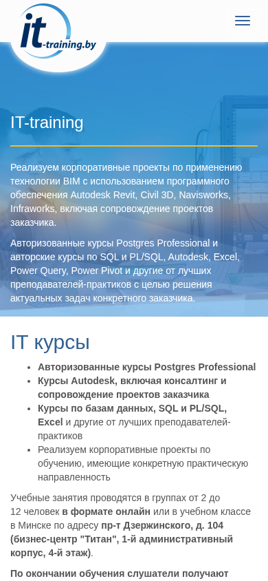 | AI-анализ | This website is dedicated to IT training services, offering courses in Autodesk, Postgres Professional, PostgreSQL, SQL and PL/SQL, Excel, Power Query, and Power Pivot. The site also provides authorized courses for Postgres Professional and author's courses for SQL and PL/SQL, Autodesk, Excel, Power Query, and Power Pivot, aiming to address specific client needs. IT training projects include corporate projects utilizing Building Information Modeling (BIM) technology with Autodesk Revit, Civil 3D, Navisworks, Infraworks, and project support for clients. Classes are conducted in groups of 2 to 12 people, either online or in a classroom located in Minsk at pr-t Dzerzhinskogo, d. 104 (Titan business center, 1st administrative building, 4th floor). Upon completion of training |