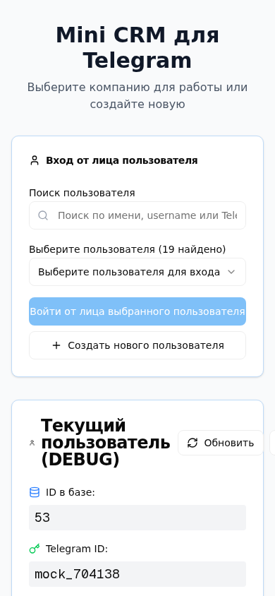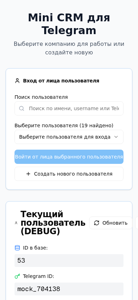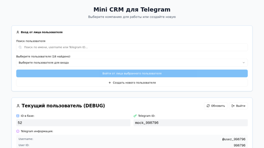 | AI-анализ | --- This online resource is a mini CRM (Customer Relationship Management) application designed for use within the Telegram messaging platform. Users can choose a company to work with or create a new one. The application offers a user interface for accessing and managing user data, including the option to search for and select specific users for login purposes. Upon selecting a user, the application allows the user to log in as that user. New users can also be created and saved locally or in a database. The current user is identified as "998796" with a corresponding Telegram ID of "mock_998796". User data, such as username and ID, is retrieved from mock data sources for development purposes and is stored in localStorage or a JSON database. The application provides functionality for managing and debugging companies and their associated employees, including the ability to check employee IDs, roles, and add new |