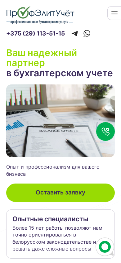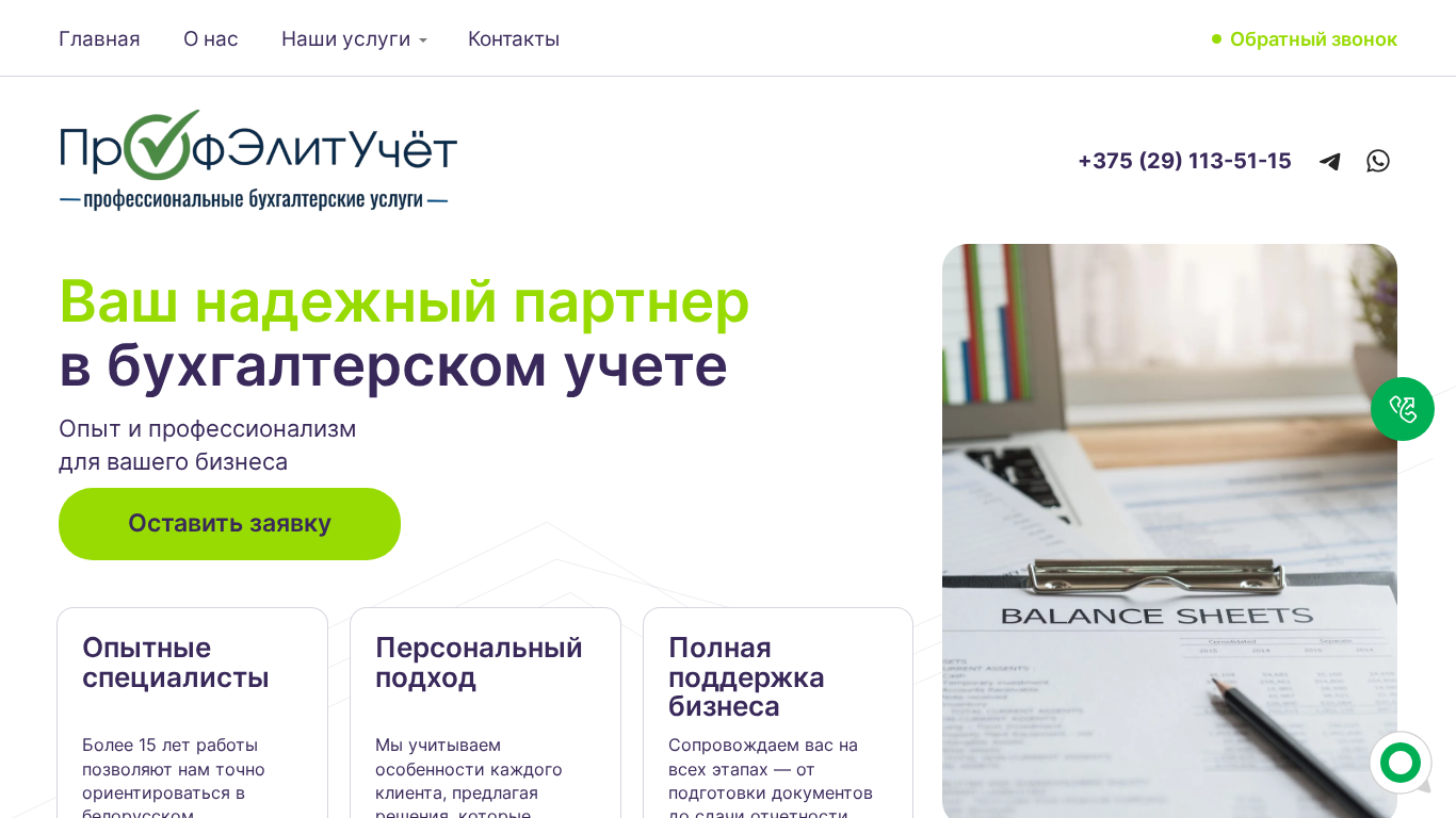 | SEO-описание | ПрофЭлитУчёт оказывает бухгалтерские услуги для малого и среднего бизнеса в Минске: постановка и ведение учета, восстановление документации, сдача отчетности. Индивидуальный подход и более 15 лет опыта. |
