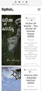| AI-анализ | The web project MetalHeads.by is a Belarusian portal dedicated to heavy music. It provides information on new releases, articles, interviews, and reviews for various heavy metal bands from Belarus. The website features a calendar of upcoming releases, with detailed information for each entry, including the band name, album title, country of origin, genre, and release date. At the time of the data, the website listed five upcoming releases for the months of October and November 2025, including albums by Victim Of Reality, Ciomny Doł, Slava Zima, Ghash, and Kristailer. Each entry includes a "Read more" link for users to access further details about the release. |