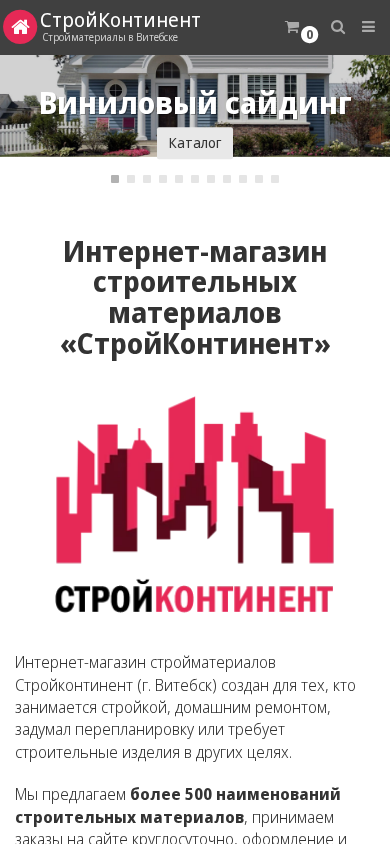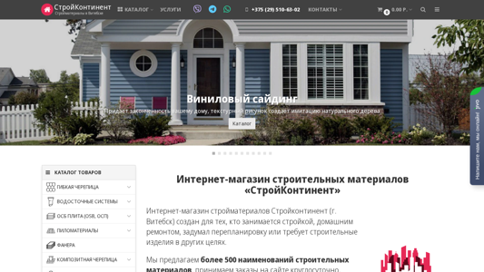 | AI-анализ | The website is an e-commerce platform for building materials in Vitsebske, Belarus, operated by StryoKontinent. It offers both wholesale and retail sales, with delivery available throughout the Vitsebske region. The site provides a catalog featuring various building materials including fiber cement sheets, OSB plates, piler materials, fencing, metal profiles, metal sheets, insulation, and more. Users can contact the company at +375 (29) 510-63-02 for inquiries. The top words on the site include 'collection', 'cart', 'tile', 'siding', 'technonikol', 'vinyl', 'flexible', 'soffits', and 'windows'. The site is located in Vitsebske at 3-я Sennenskaia, d.17a. The currency used is Euro. |