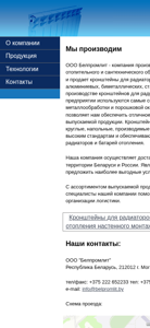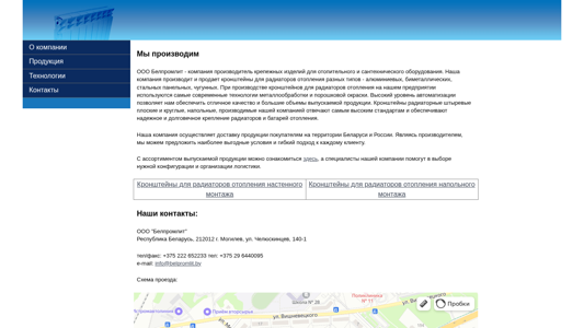 | AI-анализ | The website is for Belpromlit OOO, a Belarusian company specializing in producing and selling mounting brackets for heating radiators. The company manufactures various types of mounting brackets including aluminum, bimetallic, steel panel, and cast iron. The production process employs modern metalworking and powder coating technologies to ensure high-quality and large quantities of output. The website provides information on the company's product range, contact details, and shipping information to customers in Belarus and Russia. The company's offerings include wall-mounted and floor-mounted radiator brackets. The contact information is provided as: OOO "Belpromlit," Republic of Belarus, 212012 g. Mogilev, ul. Chelyuskintev, 140-1, with phone numbers +3 |