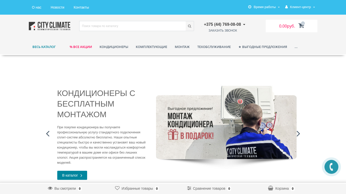 | SEO-описание | CITYCLIMATE.BY – продажа, поставка, монтаж, демонтаж, обслуживание кондиционеров, сплит-систем с бесплатной доставкой на этаж в Минске. Большой выбор бытовых, настенных сплит-систем, кондиционеров для дома, квартиры или офиса. Осуществляем монтаж с гарантией любой сложности в Минске, Солигорске, Слуцке. |