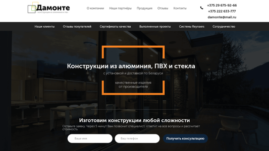 | AI-анализ | The web project "Damonte.by" is a Belarusian producer of aluminum, PVC, and glass constructions with installation and delivery throughout Belarus. The company offers a range of products, including windows, doors, balconies, and partitions. They specialize in premium systems from Reynaers. Clients can leave a request for a consultation, and a specialist will contact them within five minutes to answer questions and provide a quote. The company has completed over 800 projects, including commercial and residential buildings, factories, and private homes. Damonte.by also provides installation and repair services. |