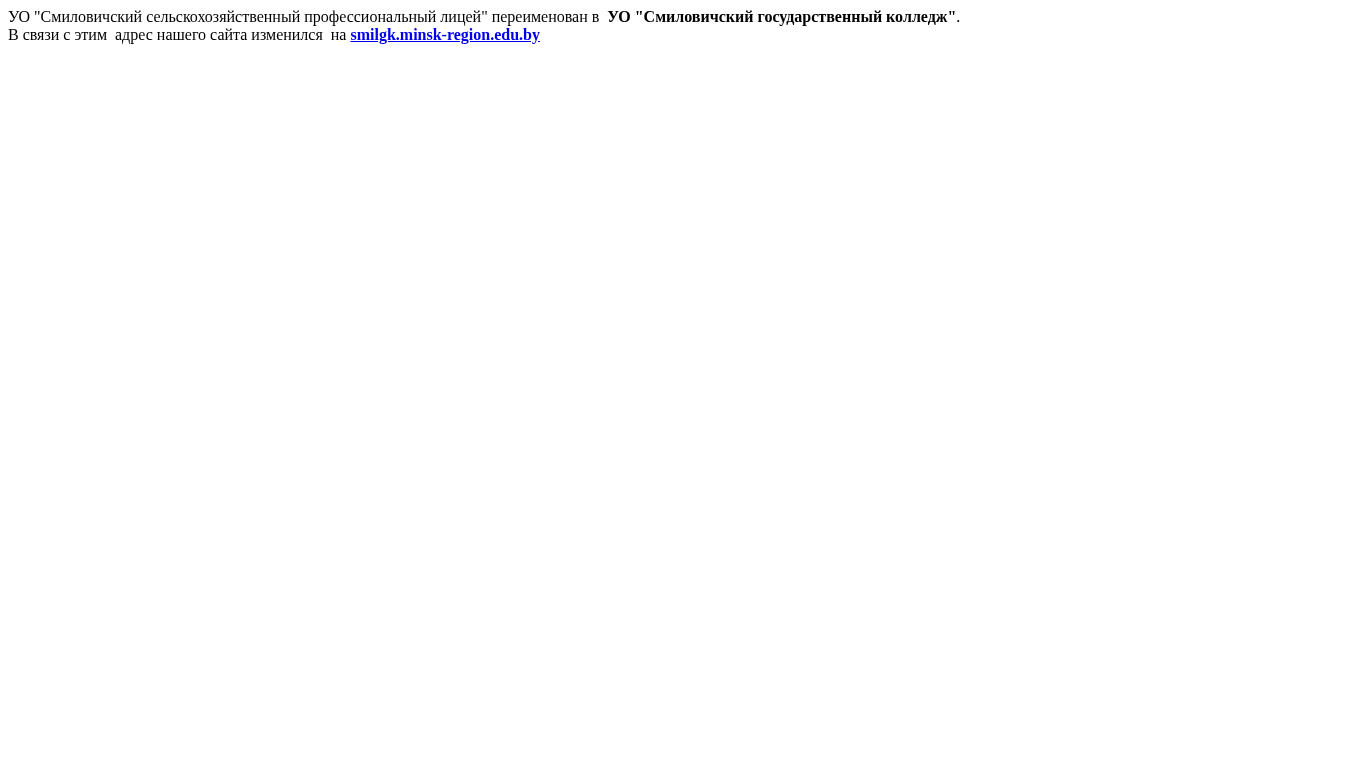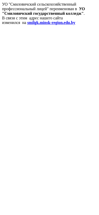 This online resource is dedicated to the Smilovichy Agricultural Professional College, which has been renamed as the Smilovichy State College. The address of this institution's website has consequently changed to smilgk.minsk-region.edu.by. Keywords associated with this site include "Смиловичский" (Smilovichy), "сельскохозяйственный" (agricultural), "профессиональный" (professional), "лицей" (college), "переименован" (renamed), "государственный" (state), "колледж" (college), "связи" (connections), "этим" (this), "адрес" (address), "нашего" (our), "сайта" (website), and "из