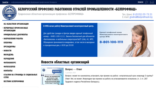 | AI-анализ | The web project "Главная - Белорусский профсоюз работников отраслей промышленности «Белпрофмаш»" (grodno.belprofmash.1prof.by) is an informational portal for the Grodno branch of the Belarusian Federation of Trade Unions "Белпрофмаш". The portal provides information on various primary trade union organizations within the region, including those in VolMet, Volkvyisky Machinery Plant, Belcard, Radiowolna, and others. The website also includes sections on organizational work, social partnership, press service, legal work, and safety. The portal features various news articles, photos, and videos, as well as information on events, youth activities, and contact information for the different organizations. The domain name includes the words "Belarusian", |