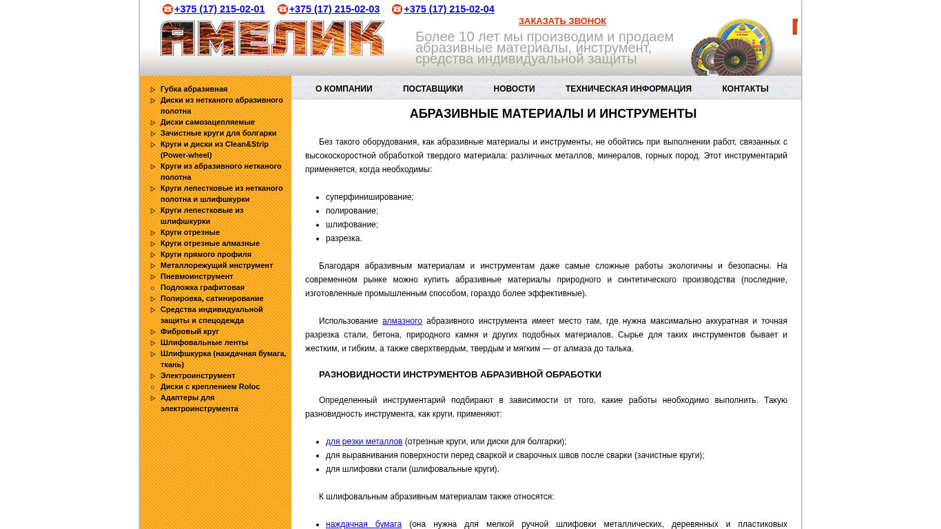 | SEO-описание | Абразивные материалы и инструменты купить в Минске. Материалы для лезвийных и абразивных инструментов, шлифовальные абразивные материалы ☎+375 (17) 344-66-92 |