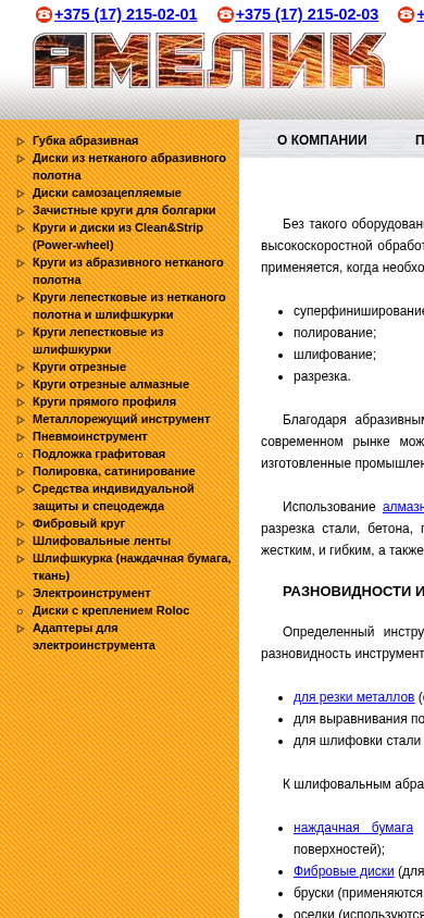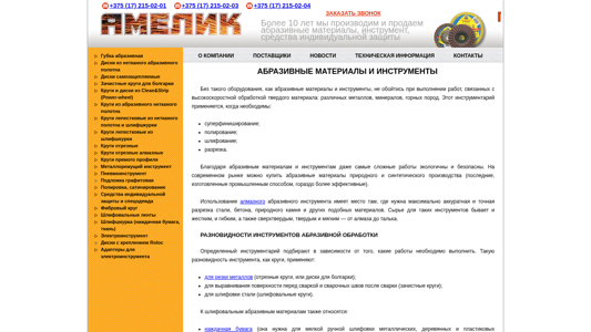 | AI-анализ | --- The web project "Амелик" is an e-commerce platform selling abrasive materials and tools in Minsk, Belarus. The website offers a variety of abrasive materials for cutting and grinding instruments, including single and double-sided grinding disks, self-adhesive sanding disks, and grinding belts. The company has been in business for over ten years and is open for sales Monday through Thursday from 8:30 to 17:00, Friday from 8:30 to 16:00, and weekends as a holiday. The contact information includes phone numbers +375 (17) 215-02-01, +375 (17) 215-02-03, and +375 (17) 215-02-04 |