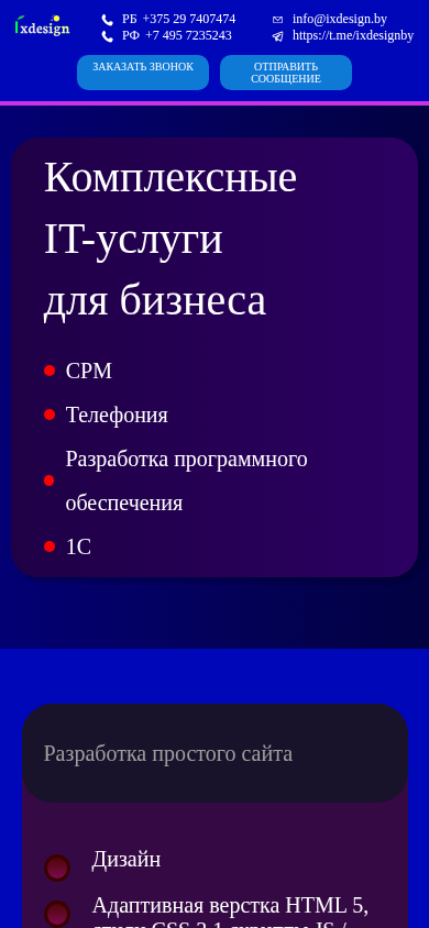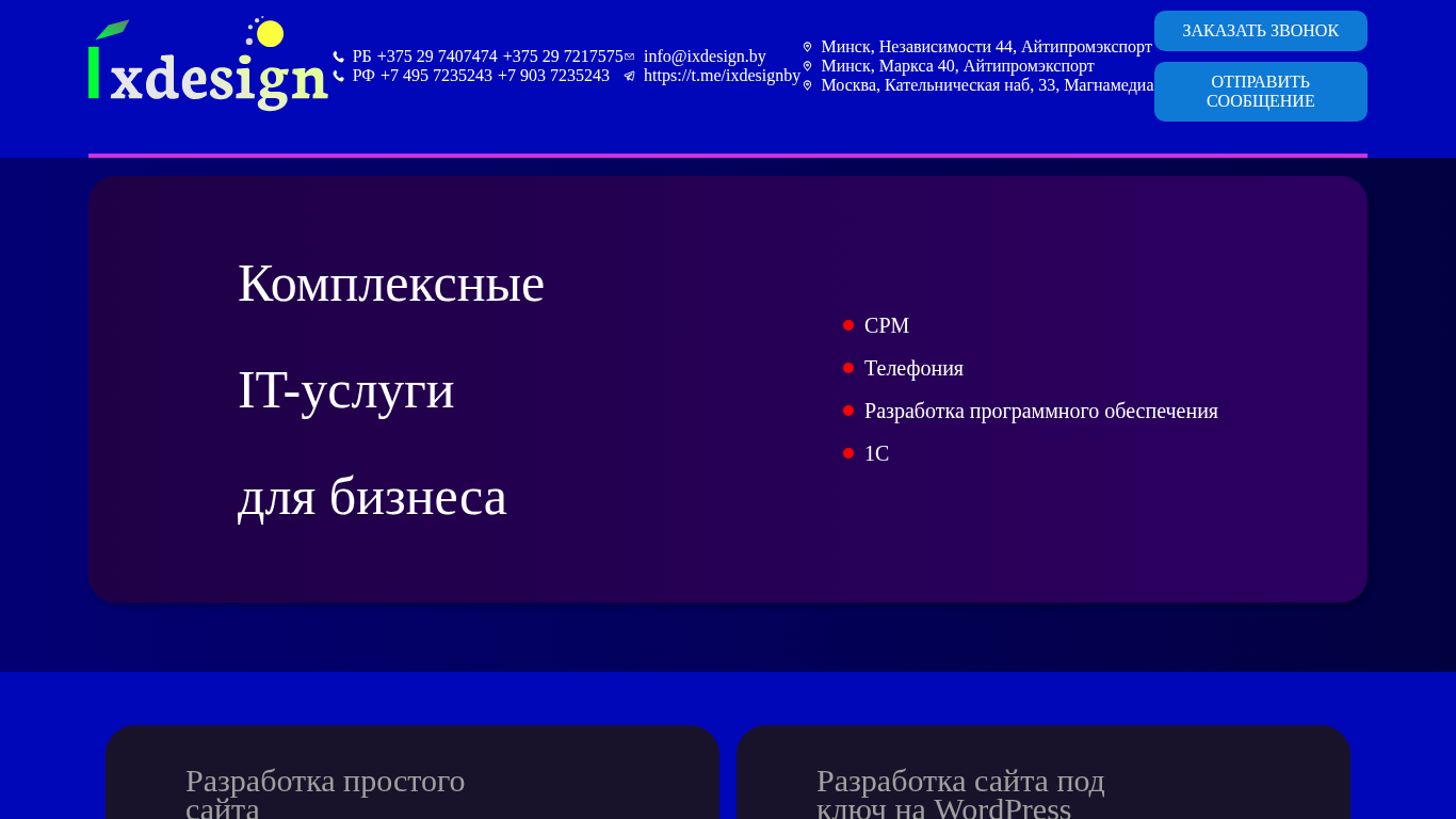 | AI-анализ | The portal Ixdesign is an IT services provider offering comprehensive solutions for businesses, including CRM, telephony, software development, and website creation. The company offers services for the registration of domains, hosting, and website development using various CMS platforms such as WordPress, Bitrix, ModX, and OpenCart. The website design follows an adaptive approach using HTML5, CSS3.1, and JavaScript/jQuery. The portal also provides services for the development of applications using Laravel and NodeJS, with support for popular frontend frameworks like Vue 3.0, React 18, and Next.js. Integration with created themes and installation of necessary plugins are part of the offered services. Additionally, the portal assists in the installation and setup of SSL certificates, email servers, and the transfer of websites from other hosting services. The contact information includes phone numbers for Belarus and Russia, email address, and |