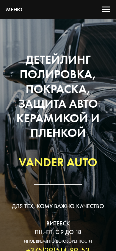 | AI-анализ | The website is for Vander auto, a local car studio offering car painting, polishing, ceramic coating, and anti-gravel screen protection services in Vitsebsk, Belarus. The title and keywords suggest the main focus is on car care and enhancement. The menu includes sections for painting, detailing, after-restoration plastic, motor anti-chrom, and various protective coatings. The contact information is provided, including the studio's location, working hours, and phone number. The website is run by Andrey, who founded Vander auto in 2019, and his team of skilled professionals. The team includes specialists in bodywork repair and painting, detailing, ceramic coating, and protective coverings. The primary services offered are car detailing, painting, and protective coatings. The website also provides information on the steps of the interaction process, from initial consultation and assessment to |