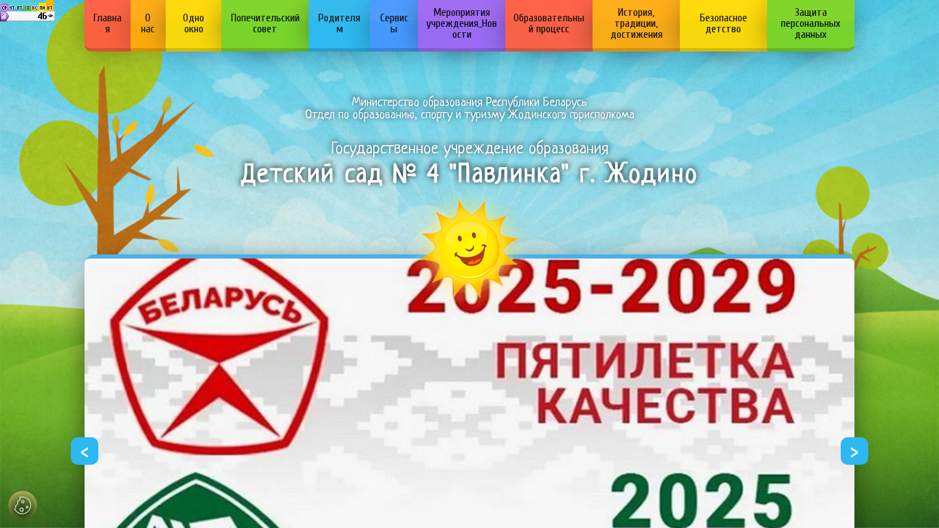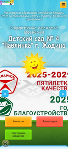 This website is for a kindergarten named "Detsky Sad No. 4 Pavlinka" located in the city of Zhodino, Belarus. The title and description of the website mention the kindergarten's name, location, and administrative information such as the administration, collective of the institution, admission procedures, anti-corruption measures, and social-psychological assistance. The website also features a photo gallery, primary trade union organization, charter of the kindergarten, succession from an educational institution, vacancies, work schedules, administrative procedures, forms, electronic application, popular inquiries, superior organizations' contacts, a parents' council, educational counselor's councils, physical education and health, food organization, musical page, pool operation, pedagogical recommendations for parents, emergency services informing parents, free spaces in the institution, and various services. The website uses the
