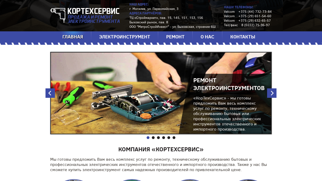 | AI-анализ | --- The portal Texkor.by offers repair and sales of electric tools in Mogilev, Belarus. Contact numbers: Velcom +375 (44) 732-73-84, Velcom +375 (29) 651-54-60, Velcom +375 (29) 632-65-57, Tel/fax 8 (0222) 75-96-97. Address: g. Mogilev, ul. Pervoмайская, 3. Partners' addresses: TC «Строймаркет», pav. 15, 145, 151, 153, 156, Bыховский рынок, pav. 8, OOO |