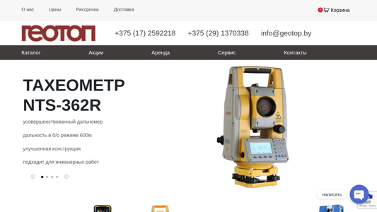 | AI-анализ | This website is a Belarusian e-commerce platform specializing in the sales and services of geodetic instruments such as theodolites, laser levels, total stations, and GPS receivers. The title "Геодезические приборы, ремонт, сервис - Геотоп" translates to "Geodetic Instruments, Repair, Service - Geotop." The description includes keywords related to the products and services offered, including "геодезические приборы," meaning geodetic instruments, and "сервис," meaning service. The website offers sales of various types of geodetic instruments, such as tacheometers, lasers, and GPS receivers, as well as repairs and services for these devices. The contact information, including phone numbers and an email address, is also provided on the website. The website also includes a catalog section, |