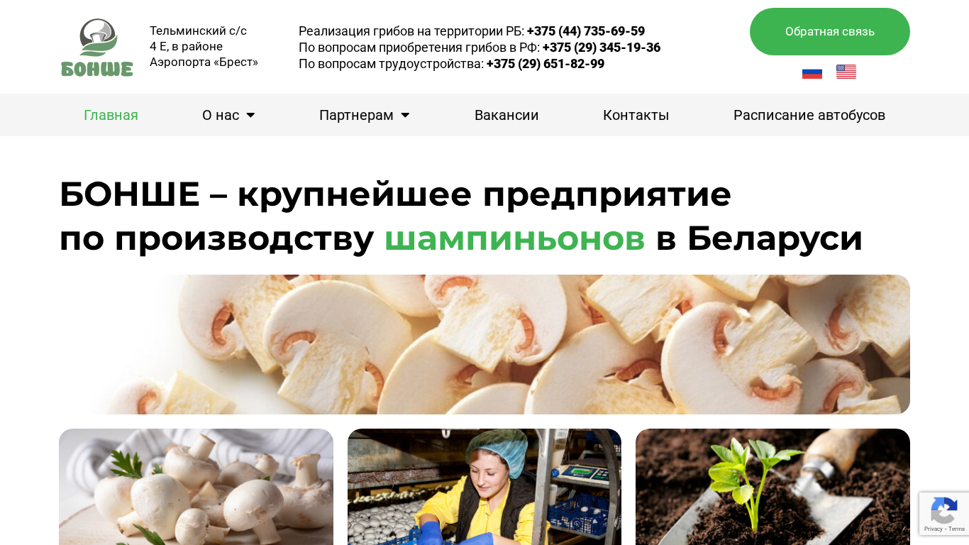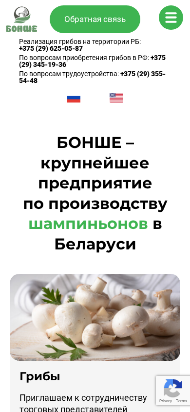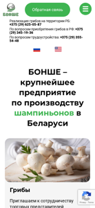 | AI-анализ | The portal BONSHE is a limited liability company based in Belarus, with a focus on the sale and production of mushrooms. The company, which is located near Brest airport, offers mushroom sales within Belarus through the phone number +375 (44) 735-69-59. For sales in Russia, interested parties can contact +375 (29) 345-19-36. The website also provides information on employment opportunities, with the phone number +375 (29) 651-82-99. The site offers sections on the company's history, technology, documents, and partnerships, as well as information for farmers and details on products and vacancies. BONSHE is the largest mushroom producer in Belarus and in the CIS, with over six years of experience and |