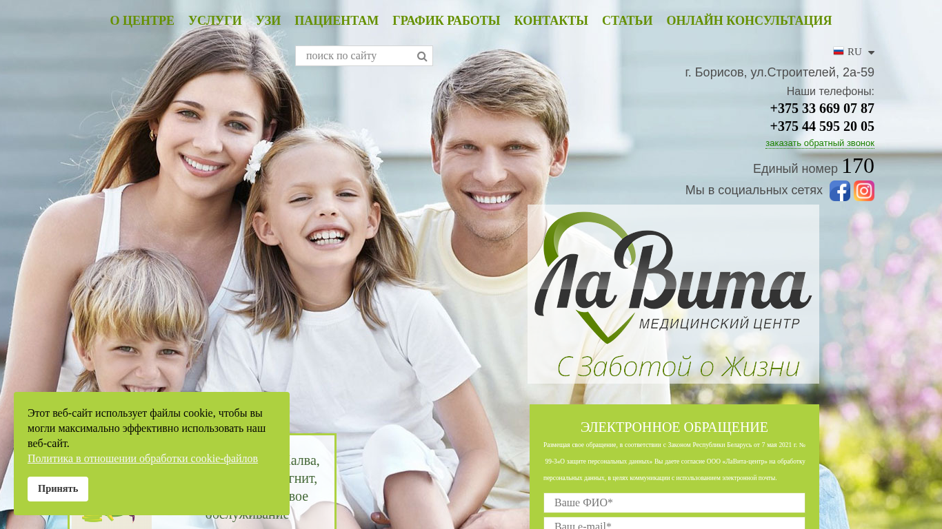 | AI-анализ | The portal Lavita.by is a medical center located in Borisov, Belarus. It offers various medical services including consultations with specialists such as gynecologists, neuroologists, surgeons, therapists, phlebologists, narcologs, ENT specialists, orthopedists, pediatricians, neurologists, and endocrinologists. Diagnostic services include analyses and ultrasounds (UZI) of the abdomen, breast, small intestine, bladder, kidneys, heart, thyroid gland, lymph nodes, salivary glands, and mons pubis. The center also provides ultrasound diagnostics in the first, second, and third trimesters of pregnancy, as well as cardiac ultrasound (Echocardiography), and SMAD procedures. The center has a procedural cabinet, a laboratory for |