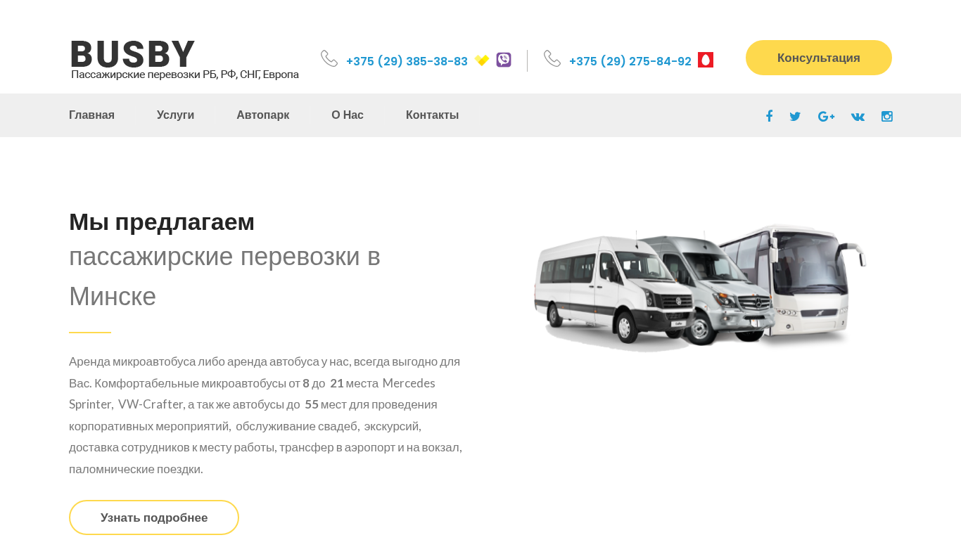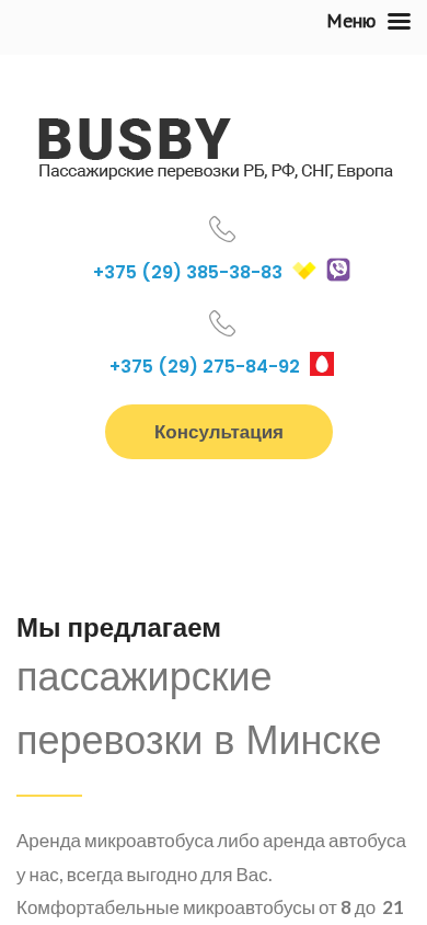 | SEO-описание | Пассажирские перевозки в Минске. Высокое качество обслуживания. Аренда микроавтобуса до 21 мест, автобусов до 55 мест. Звоните ☎ +375(29) 385-38-83 |