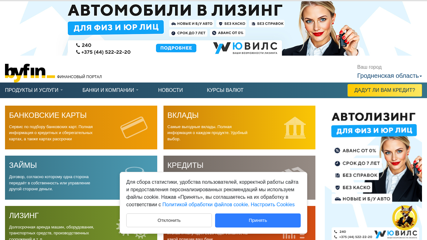 | SEO-описание | Новости из мира финансов, полный список банков и финансовых организаций Беларуси, каталог выгодных предложений по кредитам, вкладам, договорам лизинга и страхования — ByFin.by |