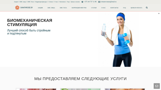 | AI-анализ | This website, titled "Sanata Rose," is a health and beauty services provider in Minsk, Belarus. It offers a range of services including body and facial treatments using the Nazarov apparatus, manual massage, figure correction, and manual face and body modeling. The website's description mentions "BMSTeas" and "BMS лица," which may refer to specific treatments or packages. The top keywords on the site include "BMSTeas," "тела," "вам," "лица," and "биомеханической стимуляции." The site also mentions "Акции," "статьи," "контакты," "Фаq," and "цены и оплата," indicating the presence of promotions, articles, contact information, FAQs, and pricing details. The site's content is primarily focused on the benefits of |