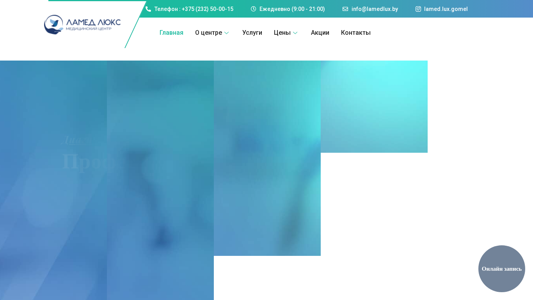 | AI-анализ | --- This online resource is titled "Медицинский центр «ЛАМЕД ЛЮКС» КАРДИОЛОГИЯ, НЕВРОЛОГИЯ, УЗИ, КОСМЕТОЛОГИЯ" and located at lamedlux.by. The website offers medical services in the areas of cardiology, neuroology, dermatology, cosmetology, and ultrasound diagnosis (UZI) in Gomel, Belarus. It has sections for doctors, appointments, equipment, and services, with contact information provided. The top keywords include "ламед", "люкс", "медицинский", "центр", "елена", "375", "при", "контакты", "ольга", "узи", " |