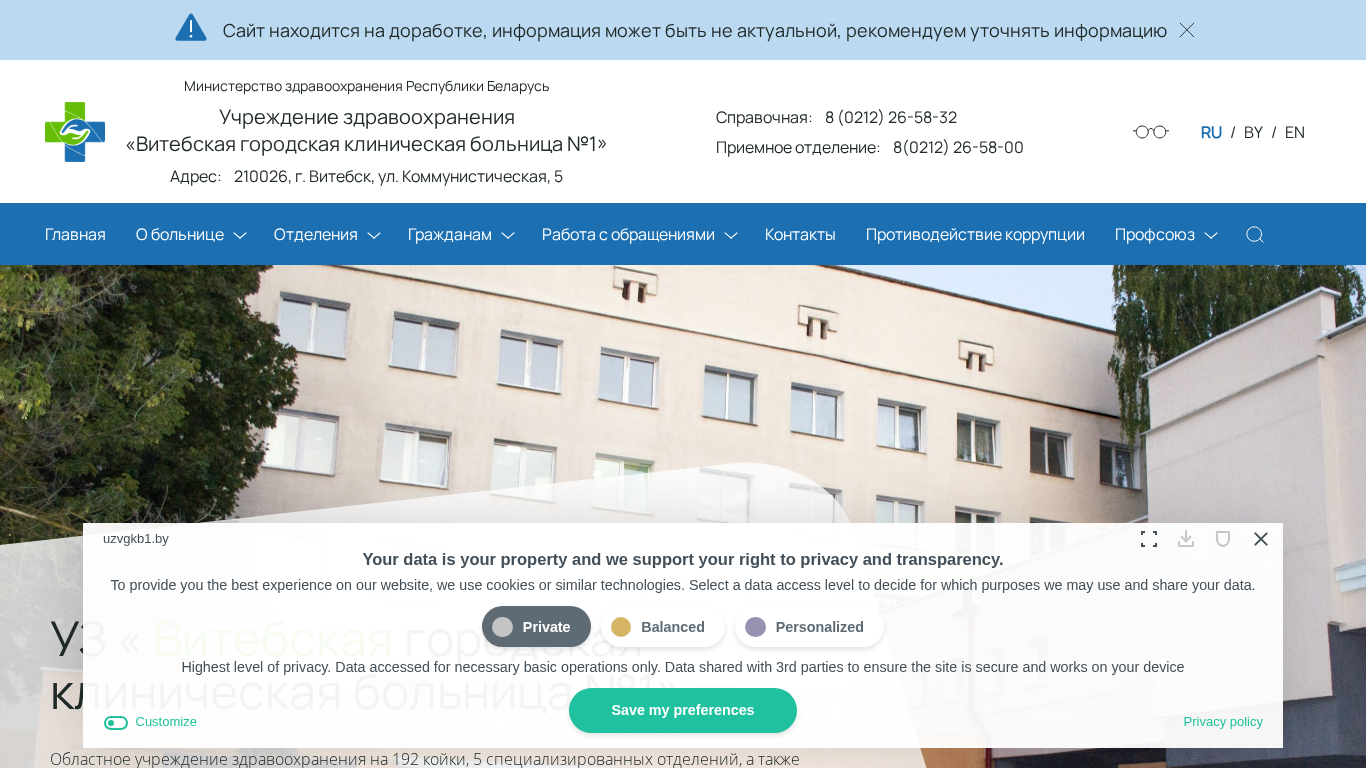 | AI-анализ | The web project "Витебская городская клиническая больница № 1" (Vitebsk City Clinical Hospital No. 1) is a healthcare institution website undergoing development. The Ministry of Healthcare of the Republic of Belarus manages the organization. The hospital is located at 210026, Kommunisticheskaya Street, 5, in the city of Vitebsk. Contact information includes the switchboard number (8 (0212) 26-58-32) and the reception desk number (8(0212) 26-58-00). The site provides information on the hospital's structure, tasks, history, vacancies, departments (consultative cabinet, cardiology, neurology, gastroenterology, and hypobaric adaptation), clinical diagnostic laboratory, |