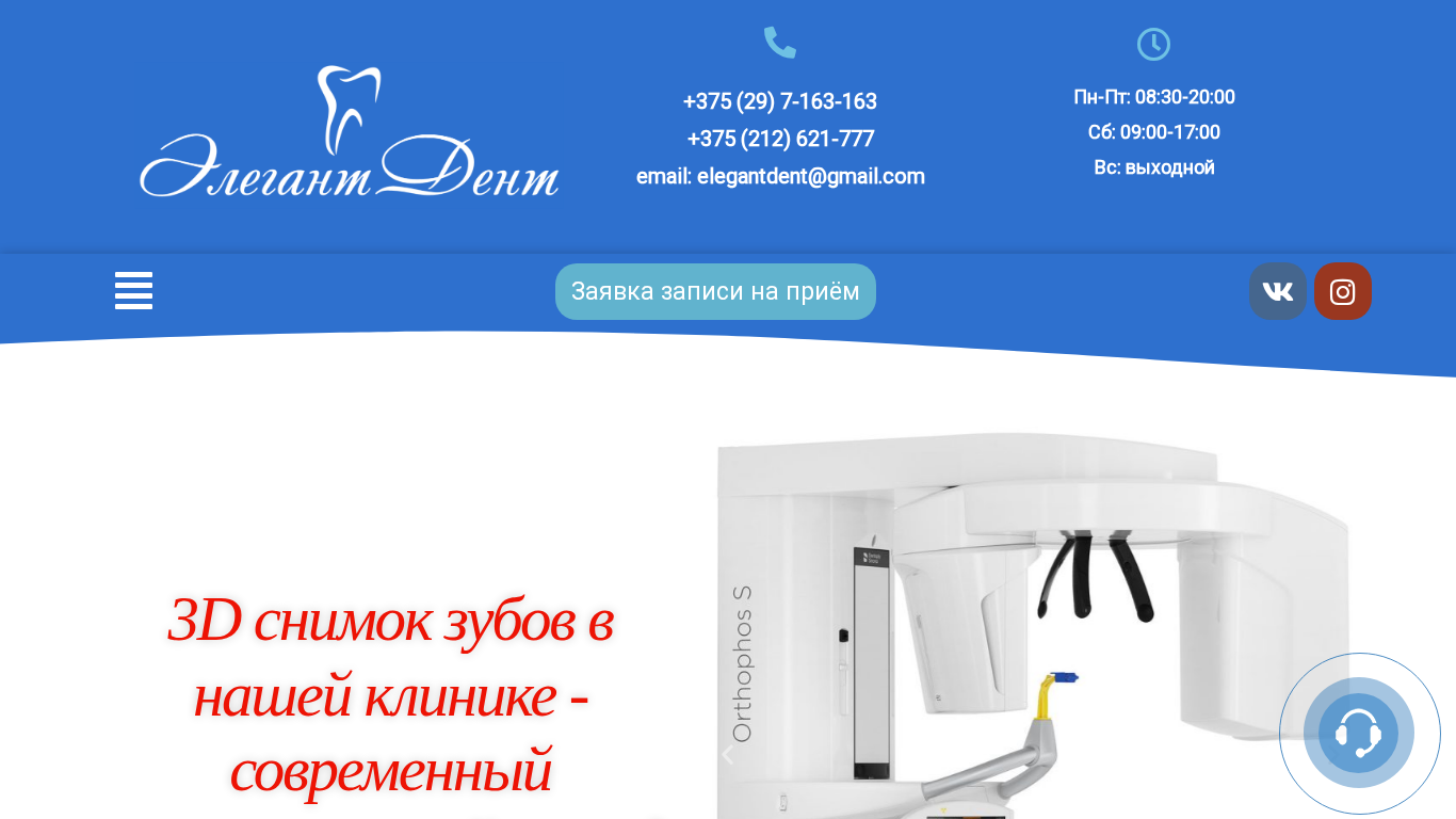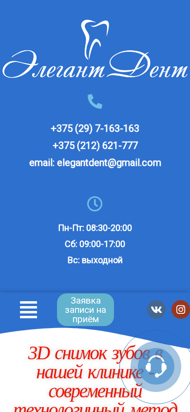 | SEO-описание | Стоматология в Витебске. Диагностика и лечение зубов. По адресу: пр-т Московский, д.74, к.1; ☎ Запись по телефонам: +375 (29) 716-31-63; +375 (212) 62-17-77 |