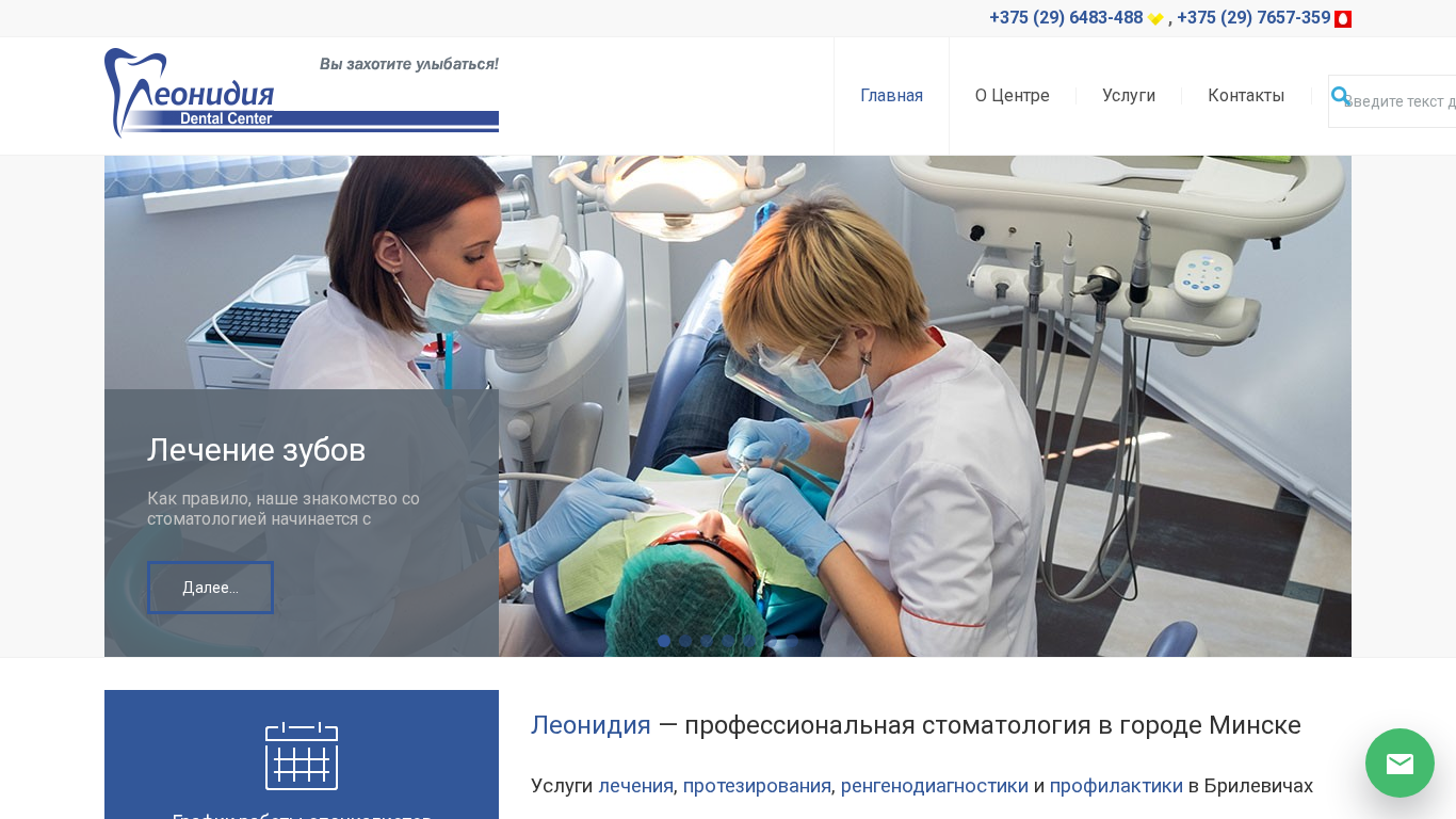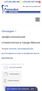 | AI-анализ | --- The website leonidia.by is for a dental clinic named "Леонидия" located in Minsk, Belarus. It offers professional dental services with highly qualified dentists and low prices. The clinic is situated in Malinovka, near the metro station. Patients can make an appointment by calling +375(29)6483-488 or +375(29)7657-359. The website features sections on achievements and awards, equipment, patient reviews, specialists, vacancies, service prices, and contact information. Services include tooth treatment, prosthetics, children's dentistry, dental X-ray, dental hygiene, dentistry, family programs, and corporate programs. The clinic offers corporate dental care programs for corporate clients to save money and enhance employee benefits. The website also provides advice on caring for |