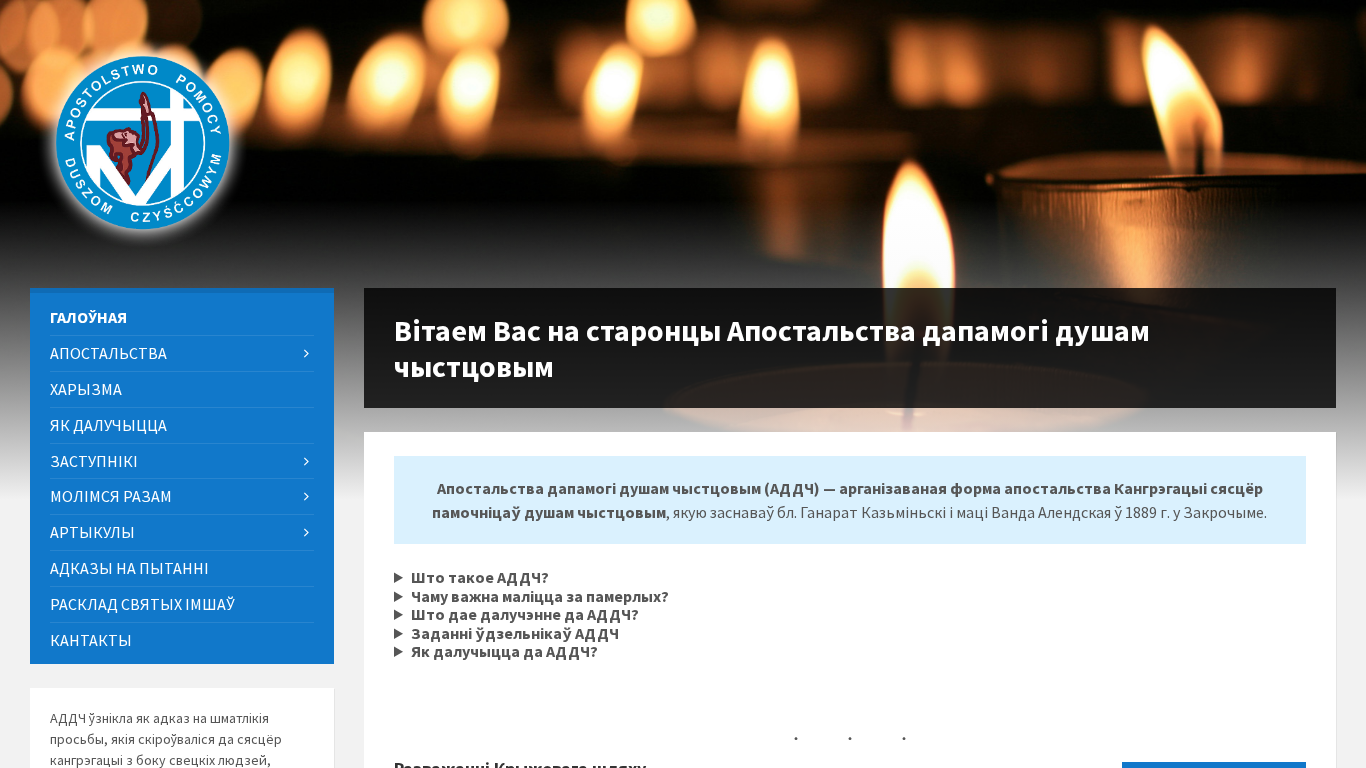 | Название / Заголовок | Вітаем Вас на старонцы Апостальства дапамогі душам чыстцовым | Апостальства дапамогі душам чыстцовым |