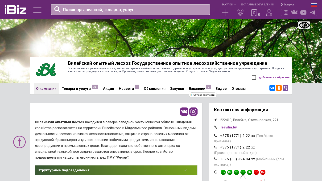 | Название / Заголовок | Вилейский опытный лесхоз Государственное опытное лесохозяйственное учреждение - Выращивание и реализация посадочного материала хвойных и лиственных, древесно-кустарниковых пород, декоративных деревьев и кустарников. Продажа лесо- и пилопродукции в готовом виде. Производство и реализация топливной щепы. Услуги по охоте. Отдых на озере. 222410, Вилейка, , Стахановская, 221 |