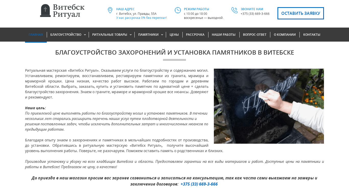 SEO-описаниеРитуальная мастерская Витебск Ритуал. Устанавливаем, ремонтируем, восстанавливаем, реставрируем памятники из гранита, мрамора и мраморной крошки. Оказываем услуги по благоустройству могил. Цена низкая, качество изделий высокое. Работаем по городам и деревням Витебской области. Выбрать, заказать, купить и установить памятник по адекватной цене