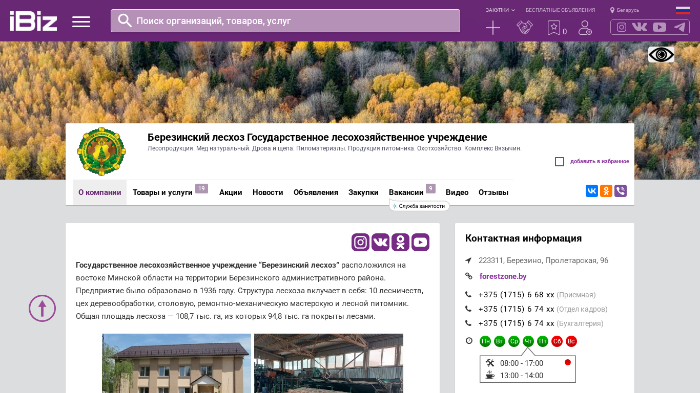 | AI-анализ | <!--- END OF FRAGMENT ---> This website is for the State Forestry Enterprise "Berezin Forest" in Belarus, which offers natural honey, firewood, wood chips, pilings, and products from the nursery, as well as an ohootholding and complex Vyazynich. The address and contact information for Berezin Forest's headquarters is provided. The website also includes sections for news, announcements, vacancies, and video reviews. |