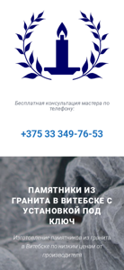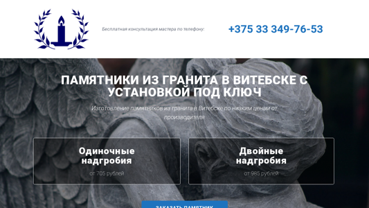 | AI-анализ | This website is dedicated to selling and producing granite monuments in Vitebsk, Belarus. Customers can place an order for a monument and have it produced at affordable prices. The website offers single and double monuments, as well as budget, figurative, and exclusive models. The company has 10 years of experience in stoneworking and guarantees official contracts, free storage, and discounts for pensioners. Prices start from 747 rubles for budget monuments, with a 10% discount, and the production time is within two weeks with a 6-month interest-free payment plan. The website also features a form for customers to request a free consultation or quote. The company specializes in various types of granite, including Carelian gabbro-diabas, Dymovsky, Pokostovsky, Lesnikovsky, Mansurovsky, Granat |