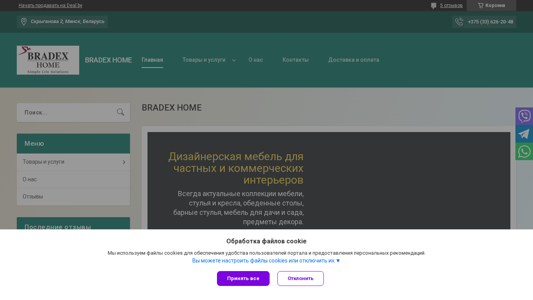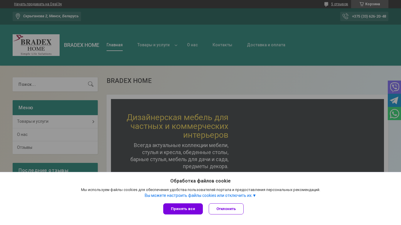 The website "BRADEX HOME" is a Belarusian e-commerce platform specializing in the sale of furniture, specifically chairs and tables, as well as related accessories. The business offers a wide range of products, including designer chairs, armless and upholstered chairs, bar stools, and tables. Custom orders are also available. The site includes sections for contact information, delivery and payment options, and a catalog featuring various furniture collections. The company targets both retail and commercial clients, promising high-quality items and prompt delivery across Belarus.