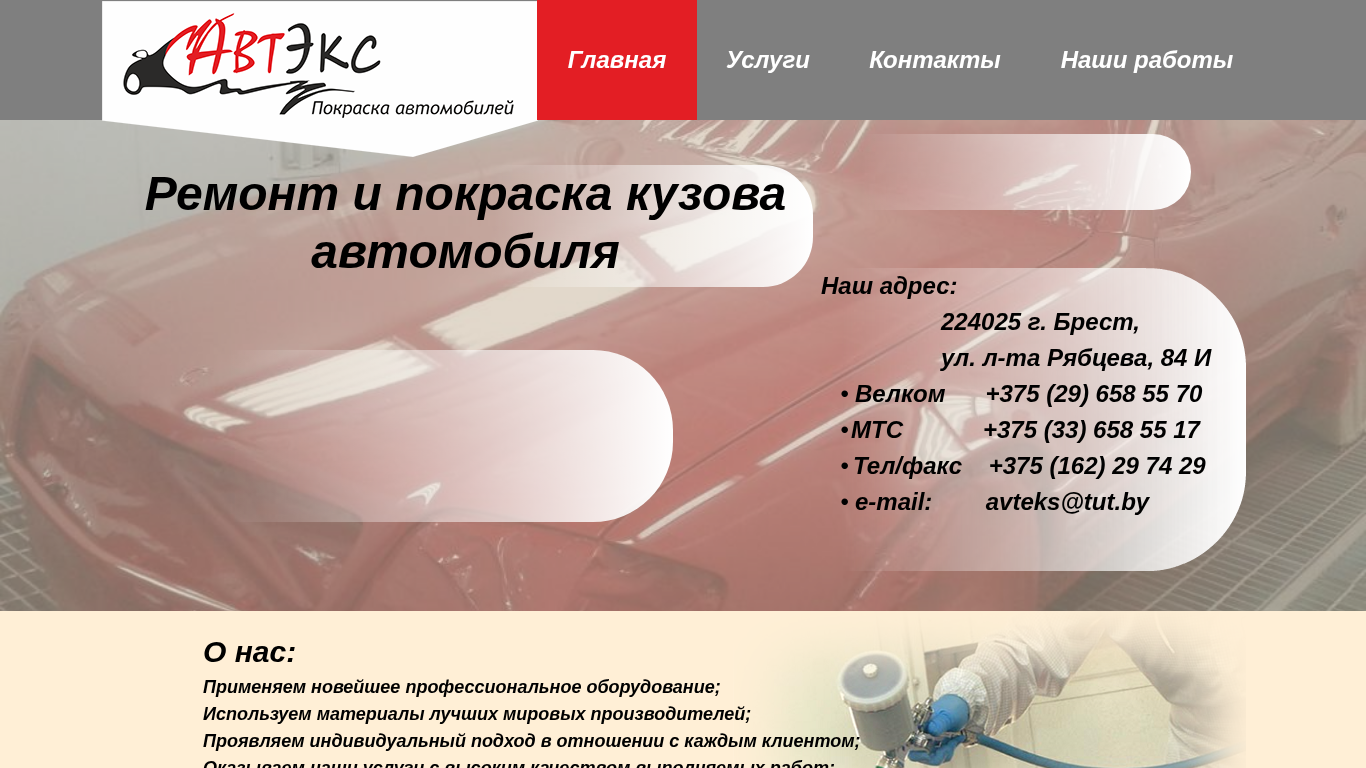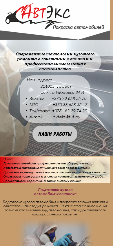 | Адрес | Главная, Услуги, Контакты, Наши работы, Ремонт и покраска кузова автомобиля, Наш адрес:, 224025 г. Брест, ул. л-та Рябцева, 84 |