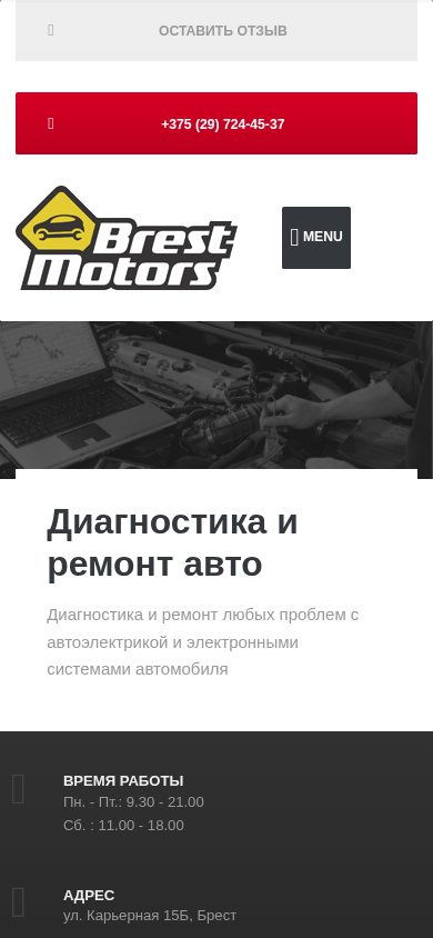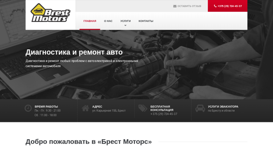| AI-анализ | The web project "Брест Моторс" is a diagnostics and repair service for automotive electrics and electronic systems based in Brest, Belarus. The website offers services for diagnosing and fixing any issues related to automotive electrics and electronics. The menu includes sections on the company, its services, auto diagnostics, repair of starters, generators, and contacts. The business operates from Monday to Saturday, 9:30 AM to 9:00 PM on weekdays and 11:00 AM to 6:00 PM on Saturdays. The address is listed as ul. Kariernaya 15B in Brest. The contact number is provided as +375 (29) 724-45-37. The website also mentions services for an evacuator in Brest and the surrounding area. "Б |