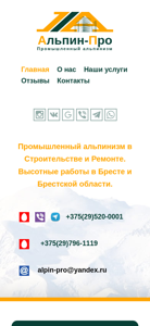 | AI-анализ | This website is for a company named Альпин-Про based in Brest, Belarus, specializing in industrial rope access for construction and repair projects in Brest and the surrounding area. The company offers various services including insulation, facade repair, balcony repair, roof repair, and installation of ventilation and water drainage systems, among others. They also provide services for hoisting goods to height and outdoor advertising installation. The company targets various clients such as property owners, construction companies, advertising agencies, clearing companies, and housing management organizations. The website provides information on their services, contact details, and testimonials. The domain name is alpin-pro.by. |