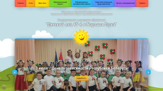 | AI-анализ | --- The website "Детский сад № 6 г.Марьина Горка" (Sad6.pukhovichi-asveta.gov.by) is dedicated to a kindergarten in Mariyina Gorka, Belarus. It provides detailed information about the kindergarten, including its administration, working hours, contacts, specialists, history, news, conditions for admission, and educational process. The site features sections on child protection, labor safety, and parental involvement. Users can also access various educational resources, forms for parents, and information on legal frameworks for early education. The site's design includes a photo gallery, an FAQ section, and a map of the kindergarten's location. The keywords associated with the site include 'детский сад' (kindergarten), 'марьина горка' (Mariy |