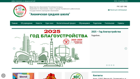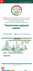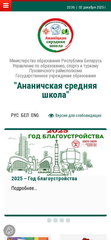 The web project "Ананичская средняя школа" (Ananichskaya Srednyaya Shkola) is the official website of a state educational institution located in Belarus. The domain belongs to the Pukhovichi District and is managed by the Ministry of Education of the Republic of Belarus. The site was last updated on December 2, 2025, and includes information on the school's mission, goals, and daily operations. Keywords associated with the site include "school," "education," "Belarus," and "activities." The site also features sections on enrollment, academic programs, and extracurricular activities. The school's history and traditions are highlighted, along with information on various projects and initiatives. The site includes a section on military-patriotic education and provides information on the school's involvement in local and regional