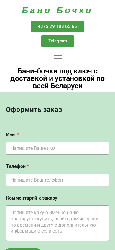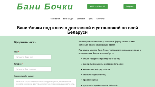 | AI-анализ | The website is a Belarusian e-commerce platform selling custom-made barrel saunas, or 'bani boчки', throughout Belarus. The title of the website translates to 'Buy Barrel Saunas in Belarus - Buy Barrel Saunas'. The description mentions that customers can buy barrel saunas with delivery across Belarus and that the saunas are made to order. The website offers both square and oval models, and customers can choose various sizes, finishes, and accessories. The contact information provided includes a phone number and a Telegram link. The website uses JavaScript for the form submission. Customers can fill out a form with their name, phone number, and comment to place an order. The form also asks for specifications such as overall dimensions and preferred options for exterior and interior finishing, seating arrangements, and additional features. The company uses German technology and |