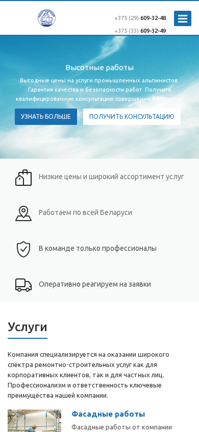 | AI-анализ | --- This website is for Pavialp, a company based in Brest, Belarus, providing industrial alpinism and high-altitude works, as well as facade and roofing repairs. The company offers services including repainting, gutter repair, insulation, and metal construction installation and removal. Contact information includes phone numbers +375 (29) 609-32-48 and +375 (33) 609-32-49. The website also features sections on company information, licensing, client testimonials, employee information, and contact details. Keywords associated with the site include industrial alpinism, high-altitude works, facade repairs, roofing repairs, and various painting and insulation services. |