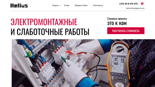 | AI-анализ | This website is a control and access management systems provider offering various services including electrical and weak current works, fire alarm systems, security alarm systems, and CCTV systems. The company also specializes in complex projects and allows users to calculate the cost for each service. The website includes a contact section with a phone number and email address. The company boasts over 100 completed projects and many years of experience. The website is available at helius.by. |