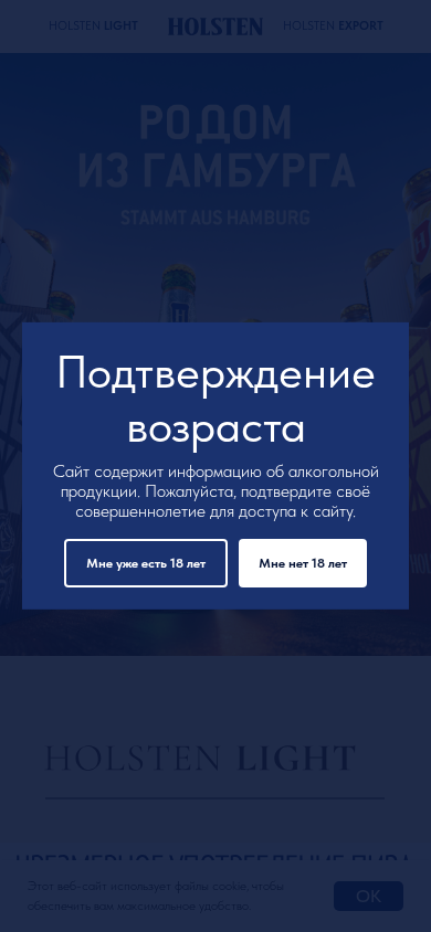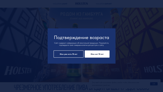 | AI-анализ | This website is for the Belarusian .BY domain of the premium German beer brand Holsten. The company, OAO "Pivovarennaya Compania Alivariya," is identified in the description. The title of the site is "Holsten," and the top keywords are "holsten," "export," "вкус" (taste), "сайт" (site), and "пожалуйста" (please). The site requires users to confirm they are of legal drinking age before accessing it, and provides a message for those underage to return when they are older. The site uses cookies to enhance user experience. The main sections of the site feature Holsten Light and Holsten Export, with descriptions of their unique flavors and pairing suggestions. Holsten Light is described as a German lager with a yellow-gold color and no hops aftertaste, |