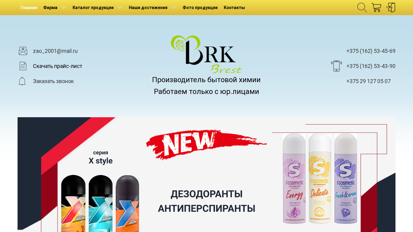 | SEO-описание | Белорусское предприятие ЗАО «БРК» по производству бытовой химии. Компания «БРК-Брест» специализируется в производстве широкой гаммы чистящих и моющих средств, а также продуктов личной гигиены. |
