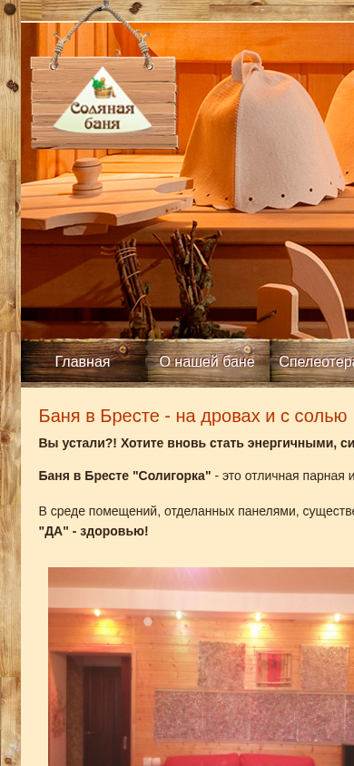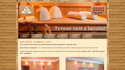 | SEO-описание | Баня в Бресте у нас самая лучшая недорого, кроме того она на дровах и с солью. Лечение солью в Бресте - решение проблемы с Астмой и другими заболеваниями. |