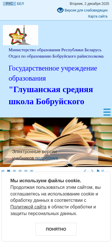 | AI-анализ | The portal 'Глушанская средняя школа Бобруйского района' is a Belarusian educational institution website with a focus on secondary education in the Bobruisk region. The title of the site is 'Глушанская средняя школа Бобруйского района' (Glushanskiy Srednyaya Shkola Bobruyskogo Rayona in English). The description section includes information about the use of cookies and the agreement to privacy policy. The site contains sections on the structure and operation of the school's administration, schedules for citizen reception, administrative procedures, electronic applications, contacts, and various services provided by the institution and public organizations. The site also includes a rating system for evaluating the quality of services and administrative procedures, as well as a gallery of photos and videos. The main objectives and functions of the educational institution are stated, along with a policy |