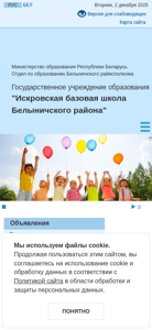 | AI-анализ | The website is that of the "Iskrovskaya Bazovaya Shkola Belynichskogo Rayona" or Iskrovskaya Base School of Belynichsky Rayon in Belarus. It is an educational institution under the Ministry of Education of the Republic of Belarus, specifically located in the Belynichsky Region. The homepage features a standard layout with a large title and a smaller subtitle, both in the Russian language. The graphic design is simple with a gray color scheme and text-based content. The top menu contains links to various sections such as the administration, pedagogical collective, and contacts. The website also includes information on the school's schedule, rules, and fees for students and parents. Additionally, there are sections for important documents, news, and a parent university. The website is accessible via a single window and is designed for standard font sizes and default sp |