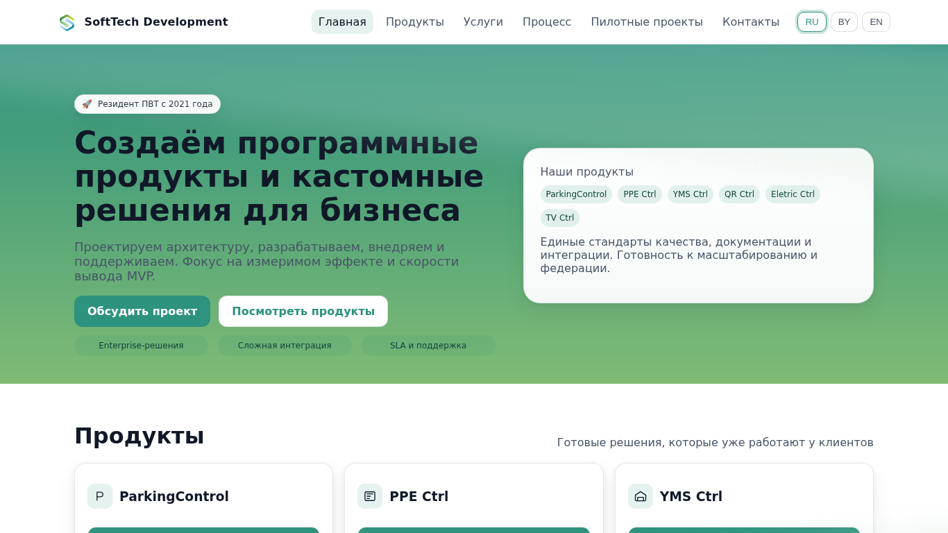 | AI-анализ | The web project SoftTech Development is a business-to-business software development company based in Belarus. They offer both custom software solutions and ready-made products for various industries. The company focuses on delivering measurable effects and fast MVP production. Their product portfolio includes ParkingControl, a parking management system with features like tariffs, billing, ANPR/SKUD integration, and reporting; PPE Ctrl, an asset management system with functions for inventory, transfers, modernization, and ERP integration; YMS Ctrl, a yard management system for slot and dock management, KPI analytics, and ERP/WMS integration; QR Ctrl, a liquid control system for REFIL with features for inventory management, anti-fraud, and POS integration; and Eletric Ctrl, an energy management system for enterprise energy consumption, with profiles, graphs, and alerts. SoftT |