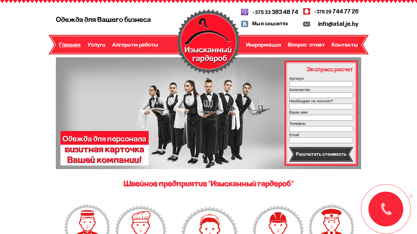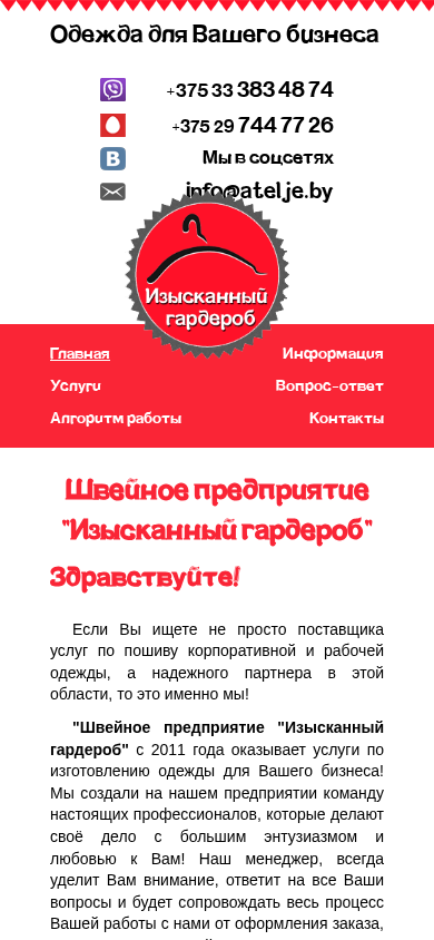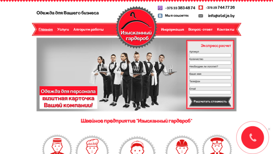| AI-анализ | This online resource is a business-to-business (B2B) website for a clothing manufacturing company named "Изысканный гардероб" (Elegant Wardrobe) in Belarus. The website offers custom-made corporate, work, sports, and uniform clothing, as well as clothing for retail networks, hotels, restaurants, cafes, and medical institutions. The company also provides logo printing and accessories services. The website includes a FAQ section about sizing and order placement, with options for express calculation and contact information. The domain name is "atelje.by." |
