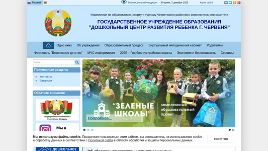 | AI-анализ | This website is for the state-run preschool development center for children in the city of Cherven. The title is "Дошкольный центр развития ребенка г.Червеня" (Preschool Center for Child Development in Cherven). The description mentions "Управление по образованию, спорту и туризму Червенского районного исполнительного комитета" (Education, Sports and Tourism Administration of the Cherven District Executive Committee). The keywords include "образования" (education), "2025" (a year), "удовлетворен" (satisfied), "учреждения" (institutions), "читать" (read), "далее" (further), "государственного" (state), "средняя" (middle), "ш |